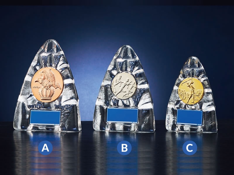 金や銀のトロフィーだと時間の経過とともに色合いや輝きは失われてゆきますが、クリスタルトロフィーなら色あせることがありません。その分、埃や傷など手入れには十分配慮する必要がありますが、材質が劣化することが無いのは大きな特色です。クリスタルトロフィーは半永久的な透明感や輝かしさから、今かなりの人気を博しています。