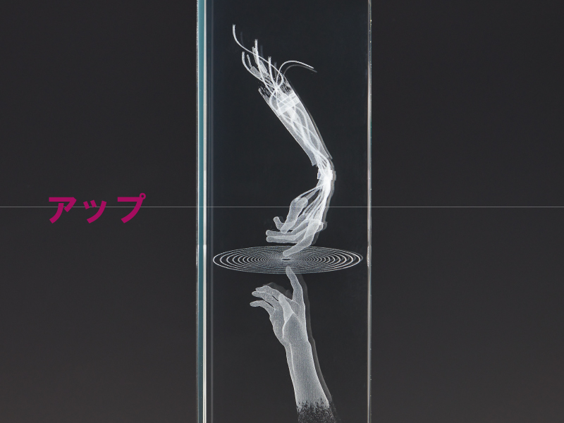 3Dレーザー加工による緻密な彫刻が、まるで宙に浮かぶように輝くクリスタルトロフィー。透明度の高いクリスタルガラスに、立体的なモチーフや文字を精密に再現し、見る角度によって表情を変える美しさが魅力です。