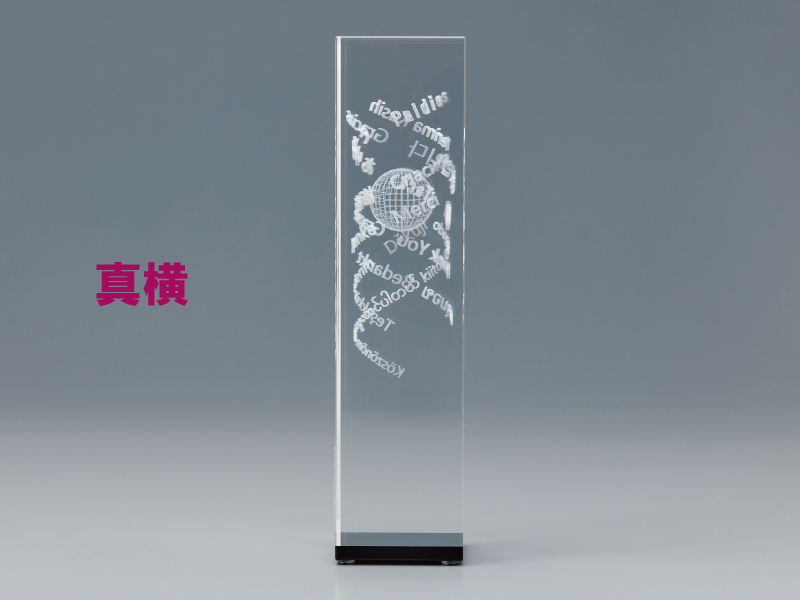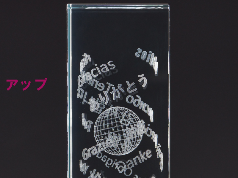 3Dレーザー加工による緻密な彫刻が、まるで宙に浮かぶように輝くクリスタルトロフィー。透明度の高いクリスタルガラスに、立体的なモチーフや文字を精密に再現し、見る角度によって表情を変える美しさが魅力です。