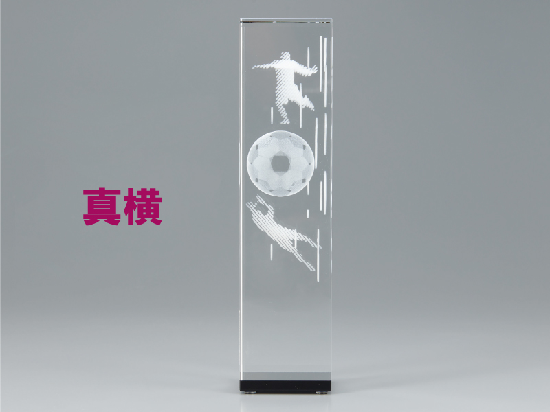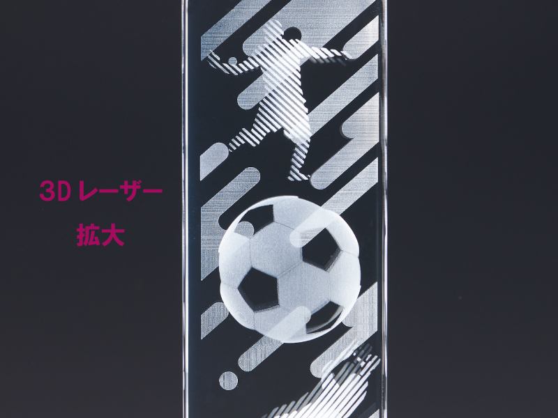 3Dレーザー加工による緻密な彫刻が、まるで宙に浮かぶように輝くクリスタルトロフィー。透明度の高いクリスタルガラスに、立体的なモチーフや文字を精密に再現し、見る角度によって表情を変える美しさが魅力です。サッカーの大会にご活用ください。