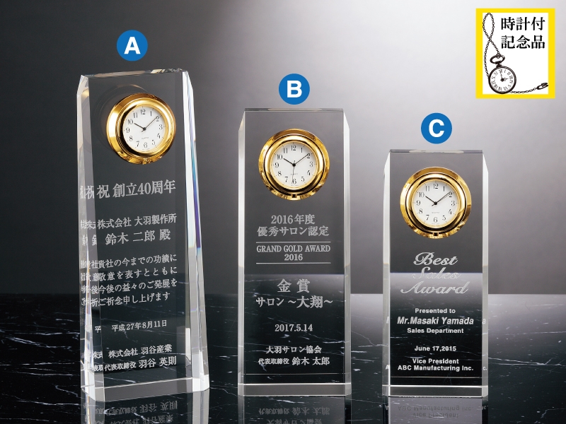 透明感のある高透過ガラスに時計を組み込み、前面にサンドブラスト加工で文字やロゴを刻印できます。前面に社名・団体名・ロゴ・表彰文などを自由に刻印可能!記念品や贈答品にふさわしい商品です!