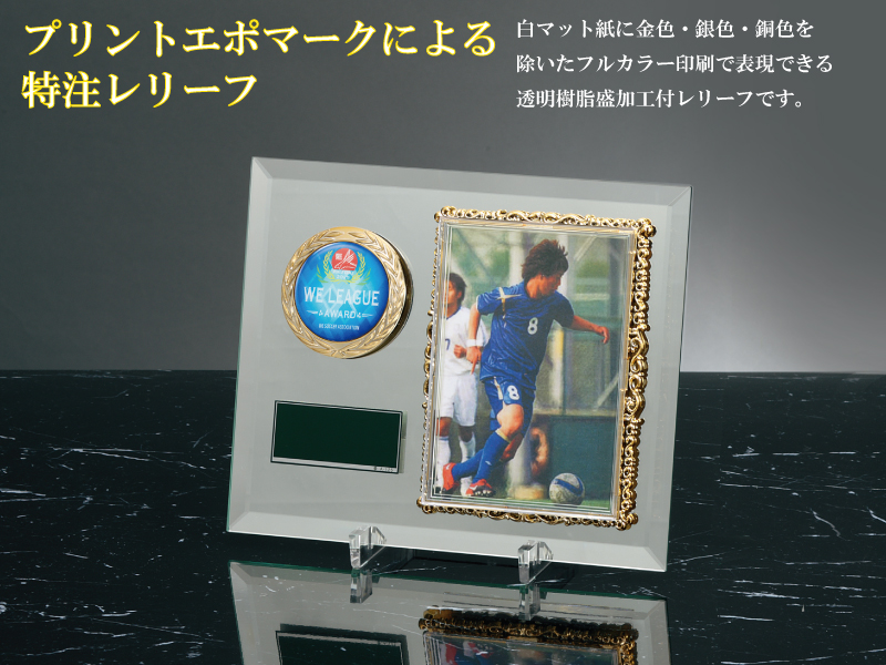 オリジナルレリーフに文字やロゴを刻印できます。前面に社名・団体名・ロゴ・表彰文などを自由に刻印可能!記念品や贈答品にふさわしい商品です!卒団大会、卒団記念品にぜひご利用ください。